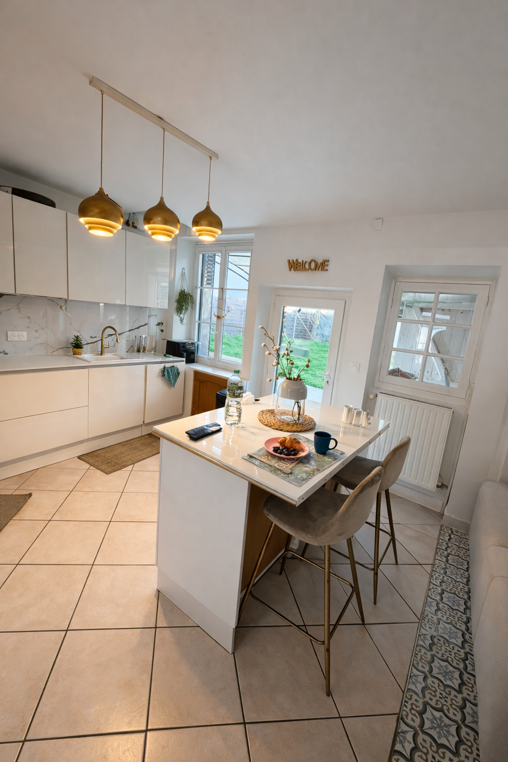 Le rez-de-chaussée dévoile une pièce de réception lumineuse, sublimée par une cuisine ouverte, créant un lieu de vie fluide et convivial.