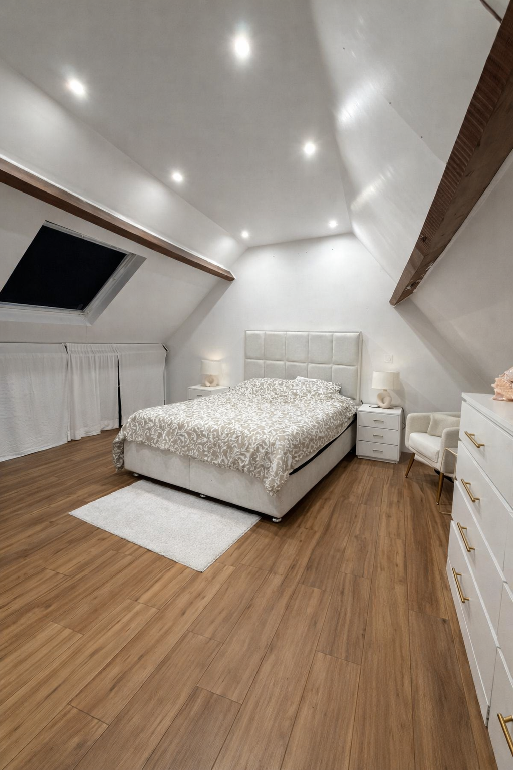 À l’étage, l’espace nuit accueille quatre chambres, dont une suite parentale offrant un espace intime et privilégié, agrémenté d’une salle de bain avec baignoire balnéo, véritable invitation à la détente.